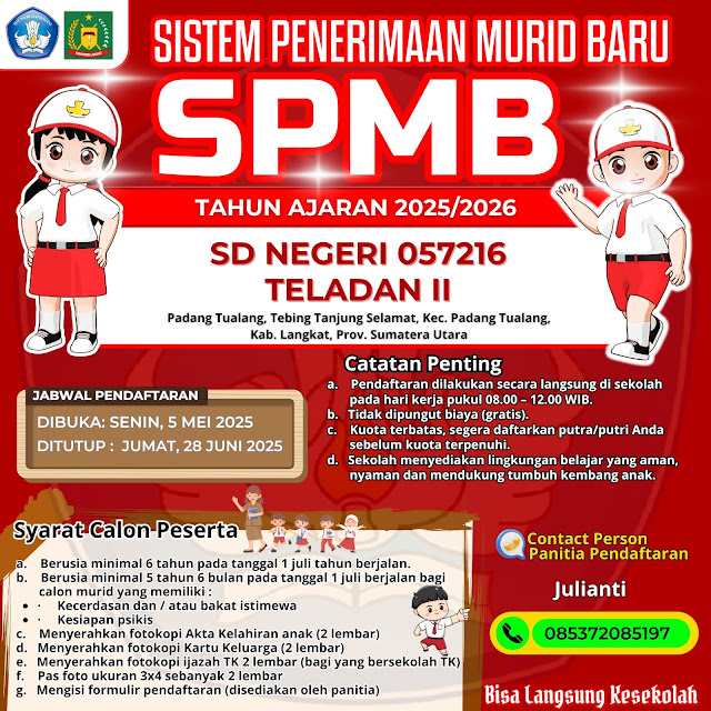 Publikasi SPMB/PPDB SD NEGERI 057216 TELADAN II Rabu, 07 Mei 2025 / 01:35 Tag: #Pendidikan #Penerimaan Peserta Didik Baru #PPDB #Publikasi Online #Publikasi SPMB/PPDB SD NEGERI 057216 TELADAN II #sistem penerimaan murid baru #spmb